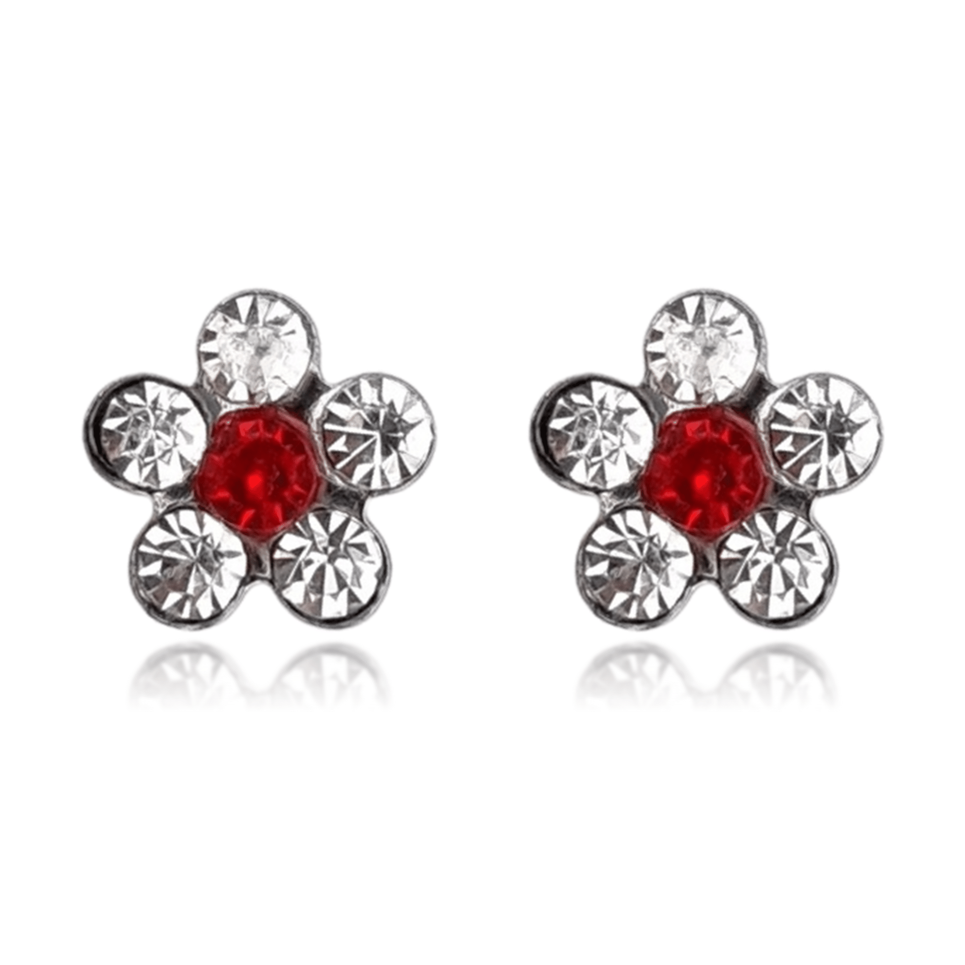 עגיל פרח קלאסי אבני קריסטל ואבן אדומה במרכז