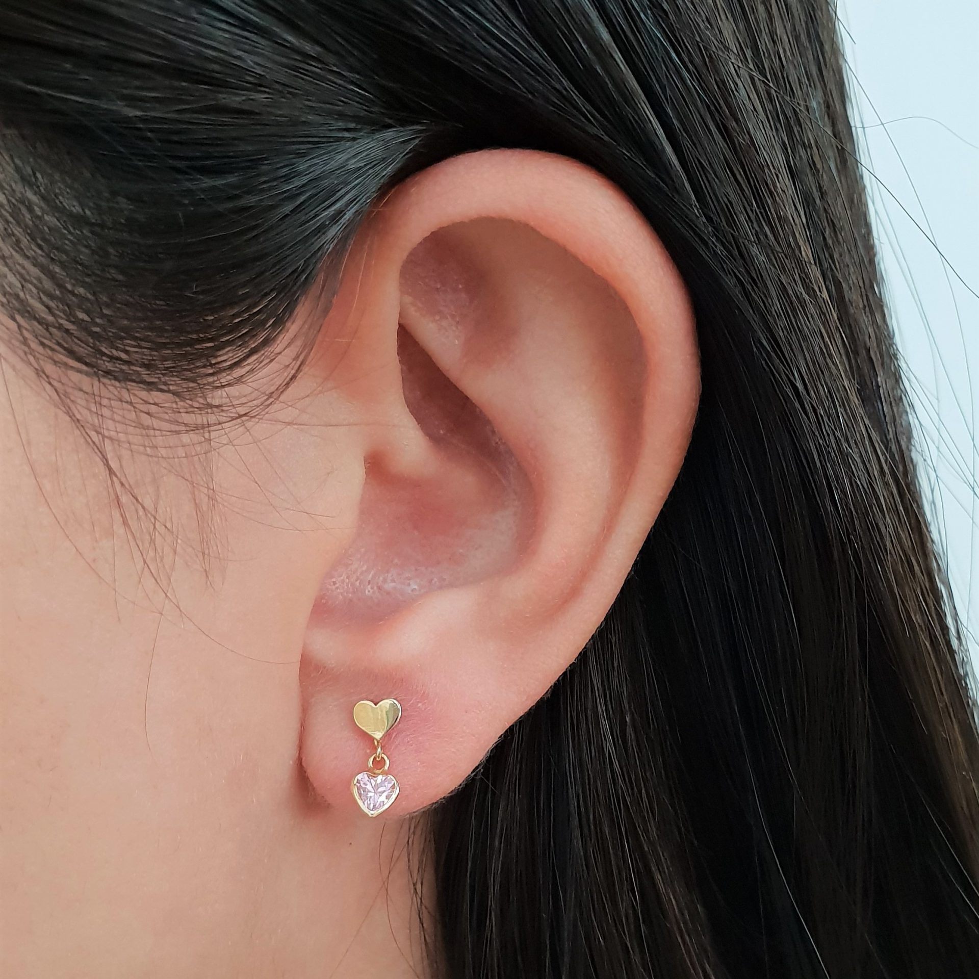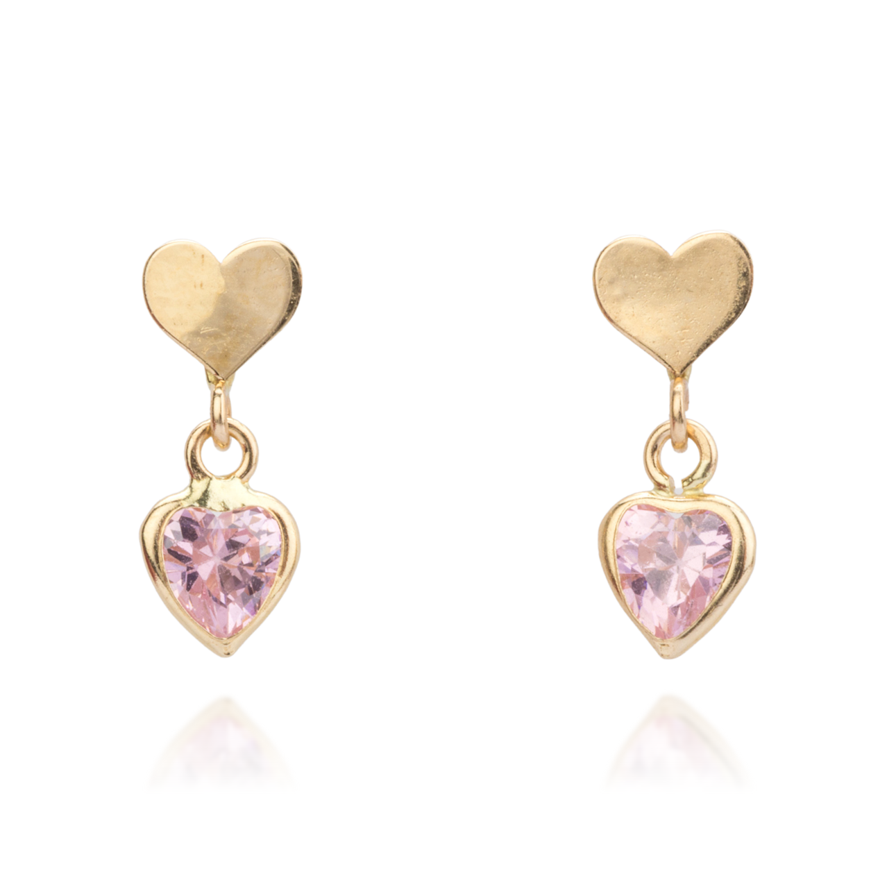 עגיל לב שממנו נתלה זרקון ורוד בצורת לב